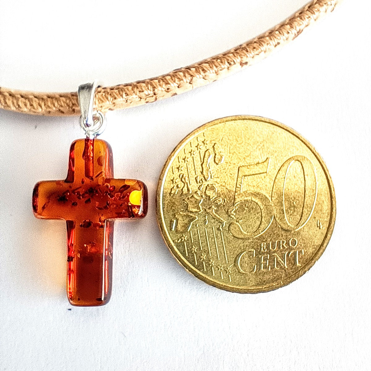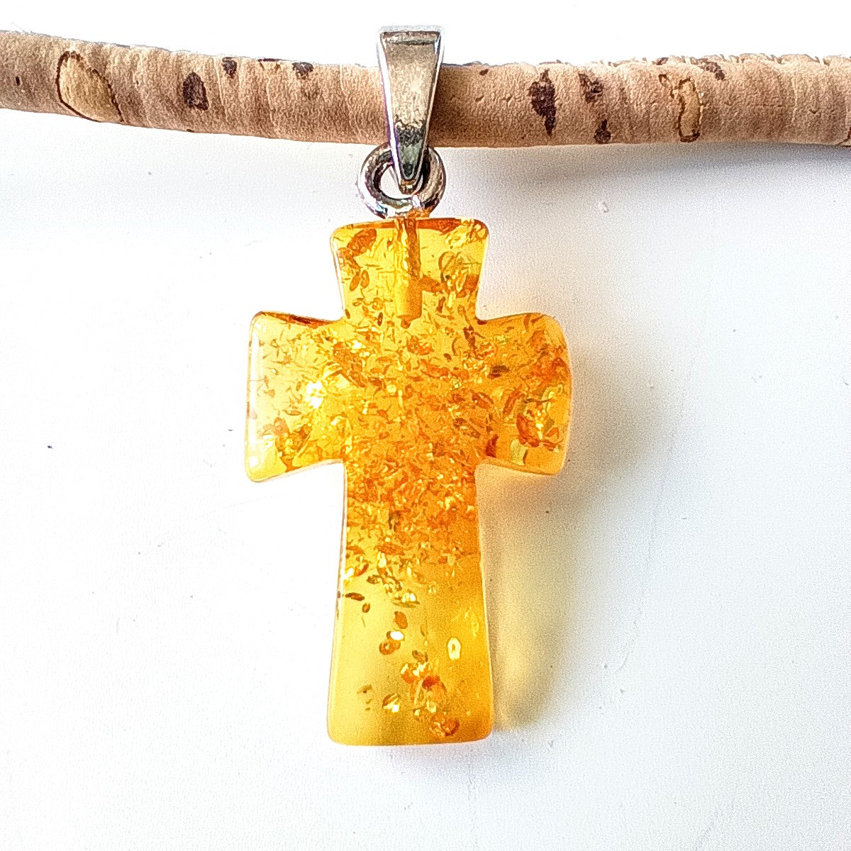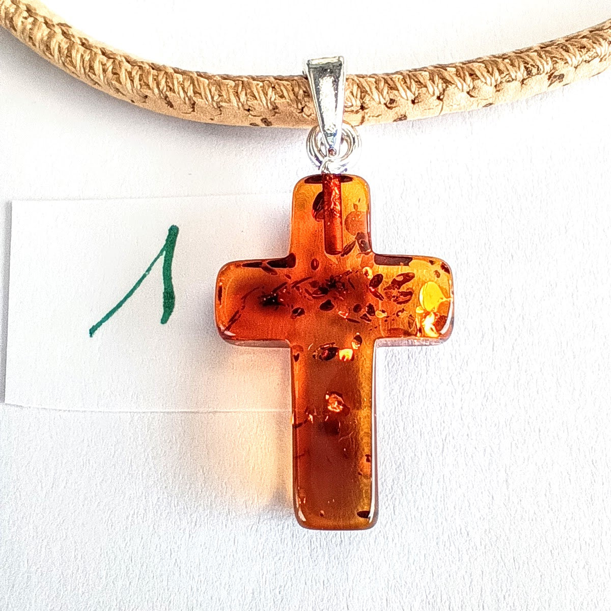 Kreuz aus litauischem Bernstein an einer Kordel aus Kork
